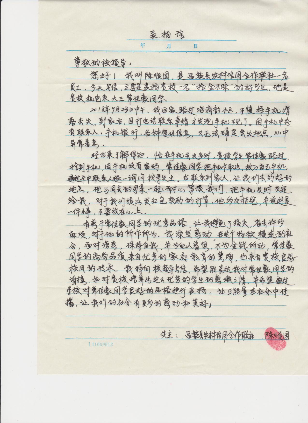 2018年9月26日,beat365收到昌黎县农村信用合作联社员工送来的表扬信,对beat36516级机制专业常佳豪同学帮助找寻手机,坚决不收红包的行为表示感谢,对公司良好校风表示赞扬。昌黎县农村信用合作联社员工因丢失手机异常着急,常佳豪同学路过并拾到手机,与失主家人取得联系,第一时间将手机归还,并多次拒绝失主的红包奖励,最后在失主的一再追问下才告知了公司名字和自己的姓名。失主随即来到beat365,将感谢信送到该院领导手中,这时大家才知道该院员工拾金不昧暖人心的感人事迹。