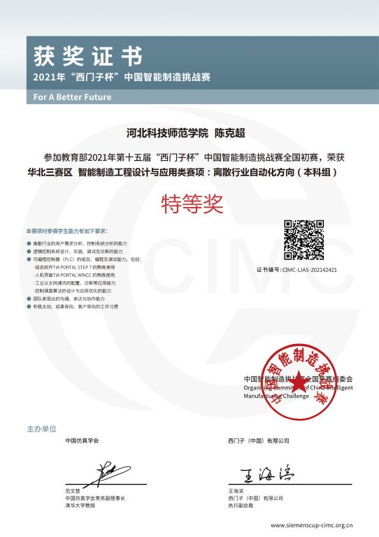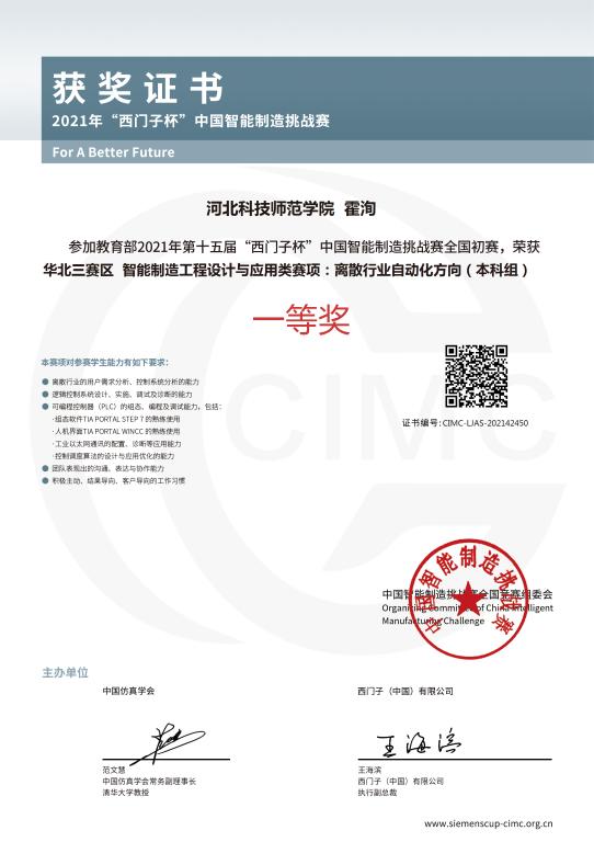 近日,2021年第十五届“西门子杯”中国智能制造挑战赛华北三赛区比赛(河北赛区)在华北理工大学成功举办。公司beat3659名同学组成的3支代表队参加了此次大赛,分别获得离散行业自动化方向(本科组)团体特等奖、一等奖、二等奖。