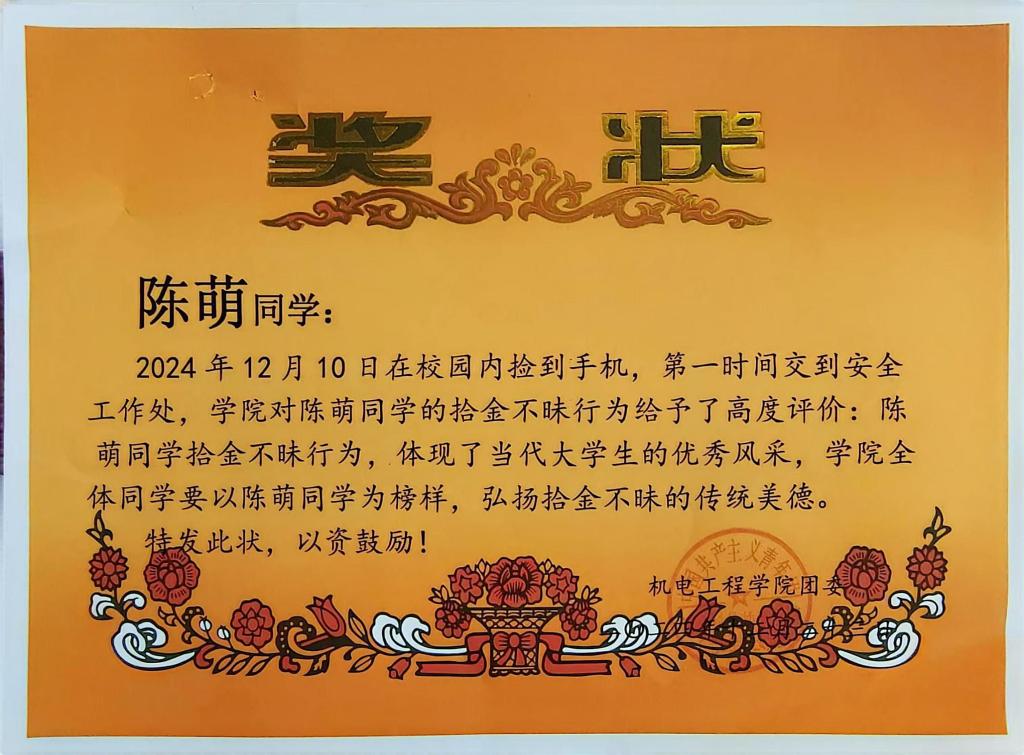 2024年12月10日,beat365电气工程及其自动化专业2302班陈萌同学,在校园内捡到一部价值 3000元的手机,并第一时间交到安全工作处。当日安全工作处工作人员将手机归还了失主。