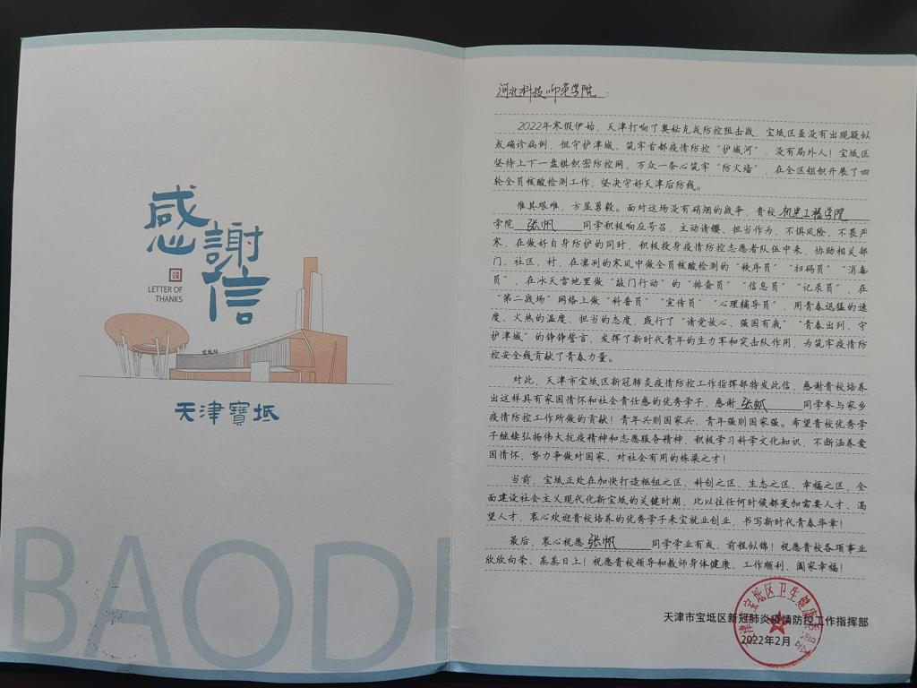 近日,beat36519机制张帆同学因在属地积极投身疫情防控志愿者队伍,天津市宝坻区疫情防控指挥部特发来感谢信。